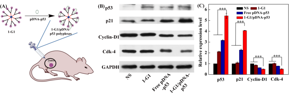 随后,研究团队更深入地研究了1-G1用于皮下移植瘤模型基因治疗的可能性。研究发现,1-G1/pDNA-p53治疗组中,p53和p21蛋白表达水平均高于其他各组(p < 0.001),且细胞周期因子Cdk-4和cyclind1表达水平也异于其他各组,且与细胞基因传递结果类似(图4)。