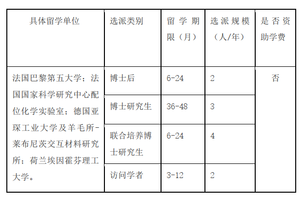 本项目为best365中国官方网站和法国巴黎第五大学(Paris Descartes University)、法国国家beats365官网亚洲网页版中心配位化学实验室(Laboratoire de Chimie de CoordinationCNRS)、德国亚琛工业大学及羊毛所-莱布尼茨交互材料研究所(RWTH Aachen University, DWI-Leibniz Institute for Interactive Materials)、荷兰埃因霍芬理工大学(Eindhoven University of Technology)合作的创新人才培养项目。项目依托中、法、德、荷高校在生物医学工程、生物化学与分子生物学、化学、生物材料学等学科领域的优势资源,面向国家重大战略需求,汇聚了一批国际学术大师和国内外研究骨干,旨在搭建具有引领示范作用的国际人才培养与合作交流平台。项目选派类别包括攻读博士学位研究生、联合培养博士生和访问学者(含博士后),国家留学基金委将资助项目人员往返国际旅费和资助期限内的奖学金。